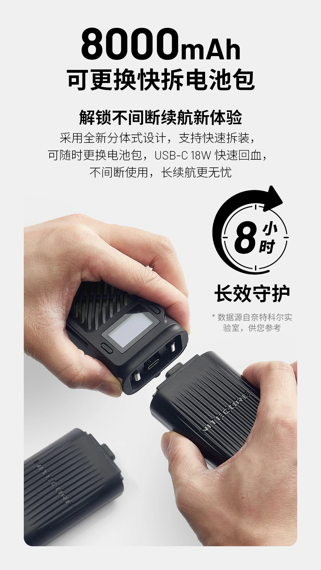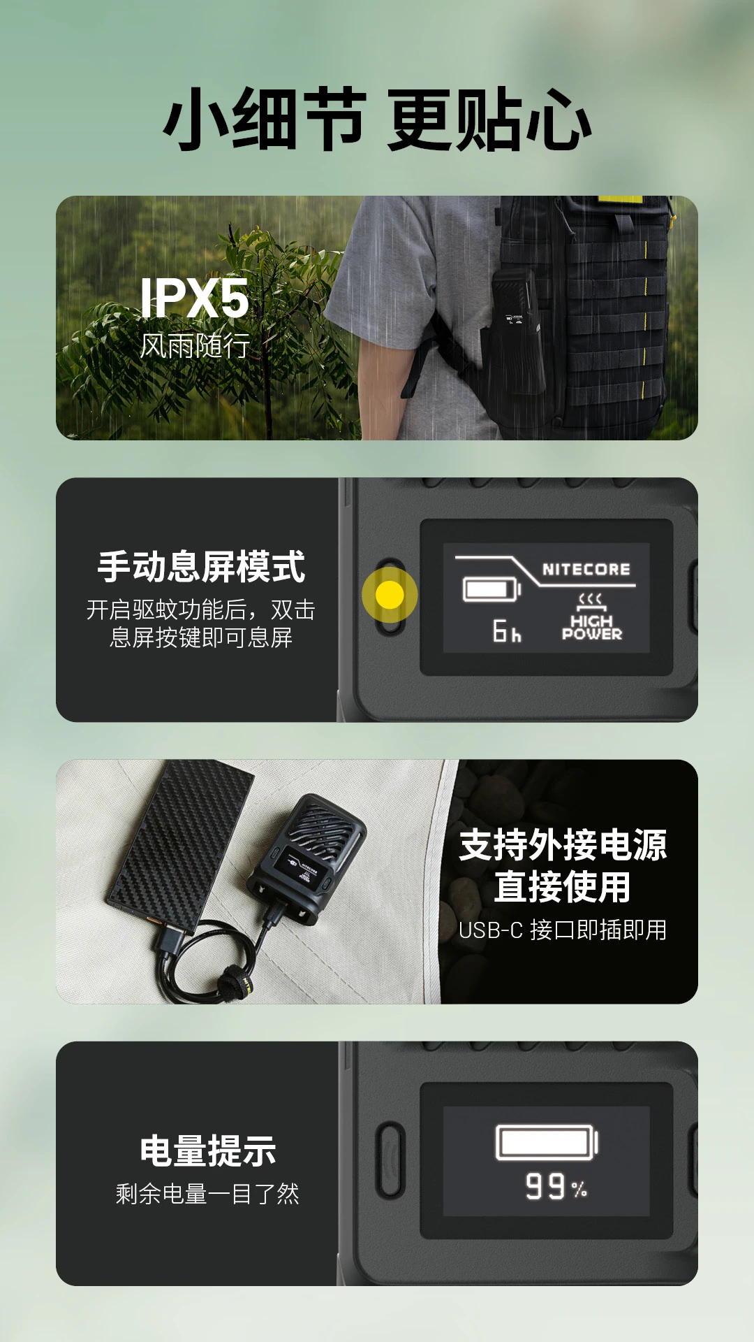 奈特科尔EMR23随身驱蚊器,180℃电热驱蚊,10分钟速成驱蚊保护区,采用全新分体式8000mAh电池包设计,支持快速拆装换电。