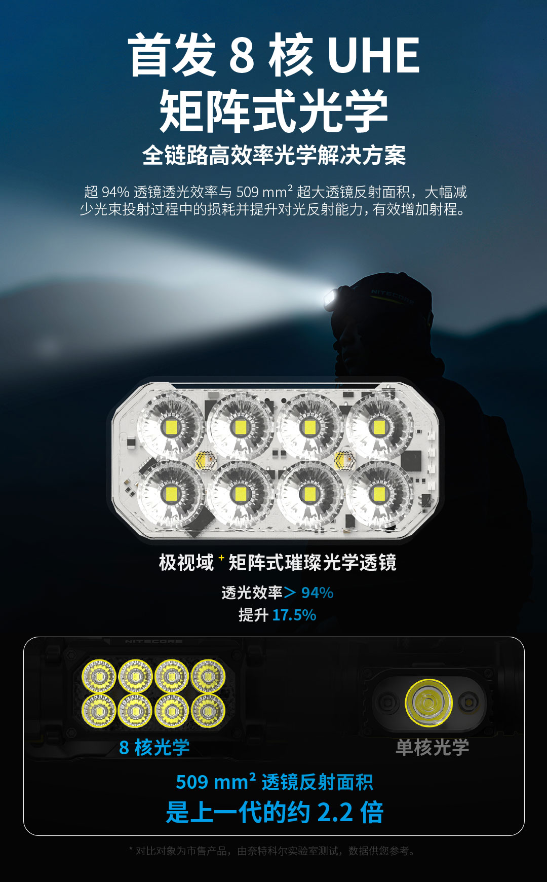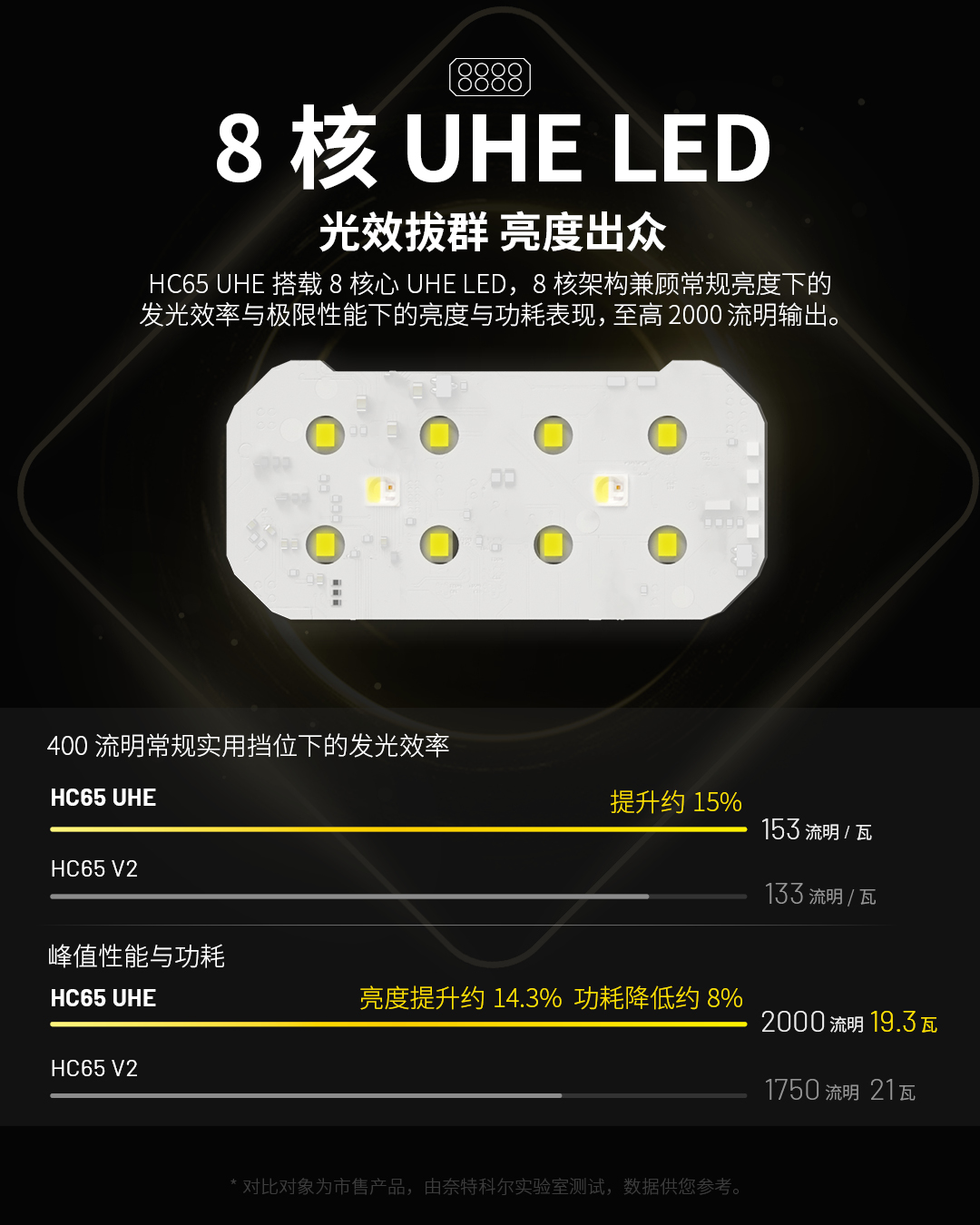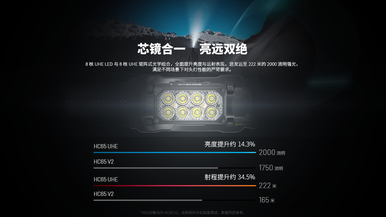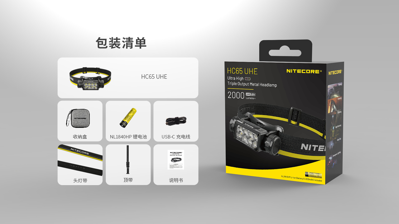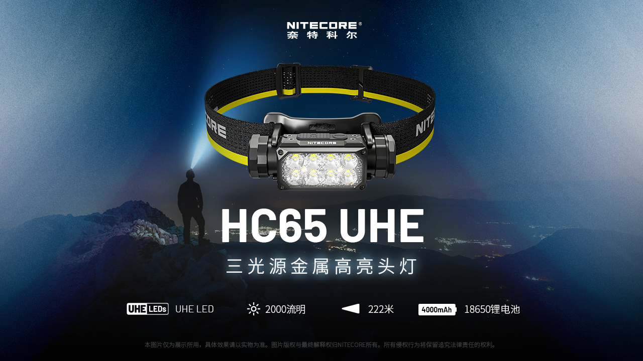奈特科尔HC65 UHE三光源金属高亮头灯,首发超高光效UHE LED,8核架构最高2000流明输出,标配4000mAh 18650锂电池,拥有IP68级防尘防水与2米防跌落高度。