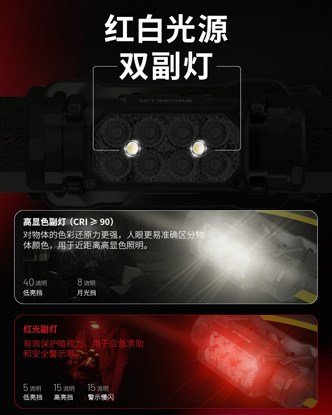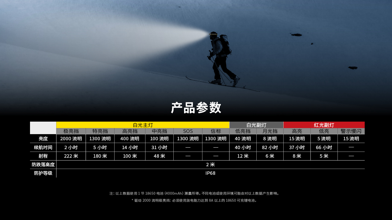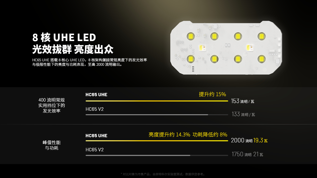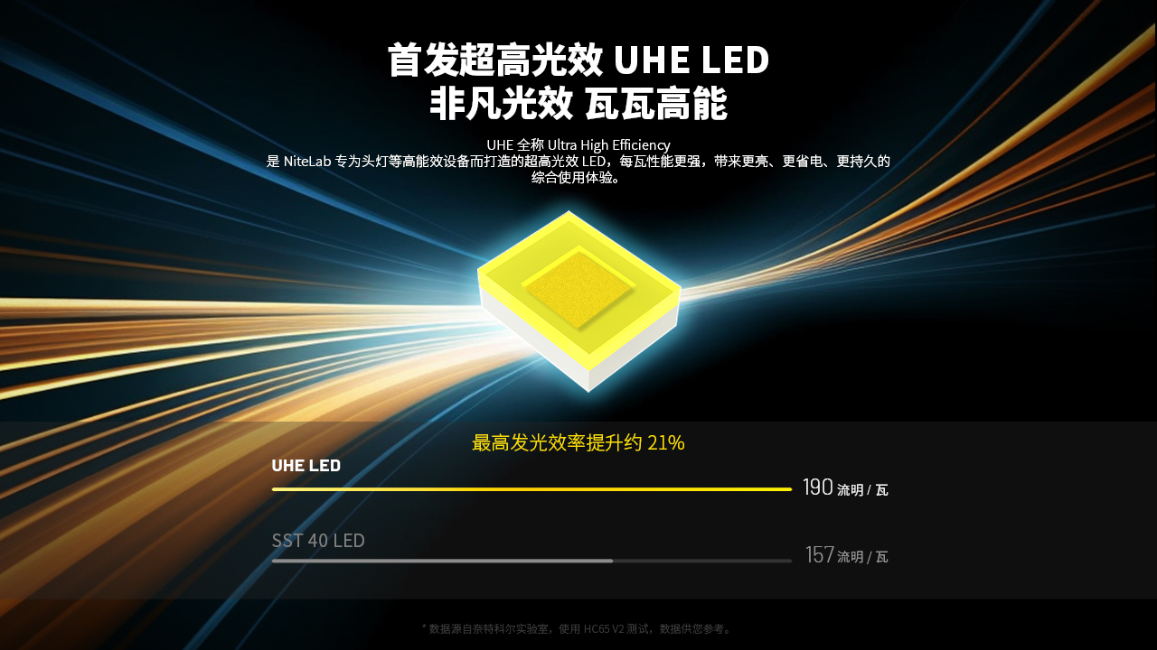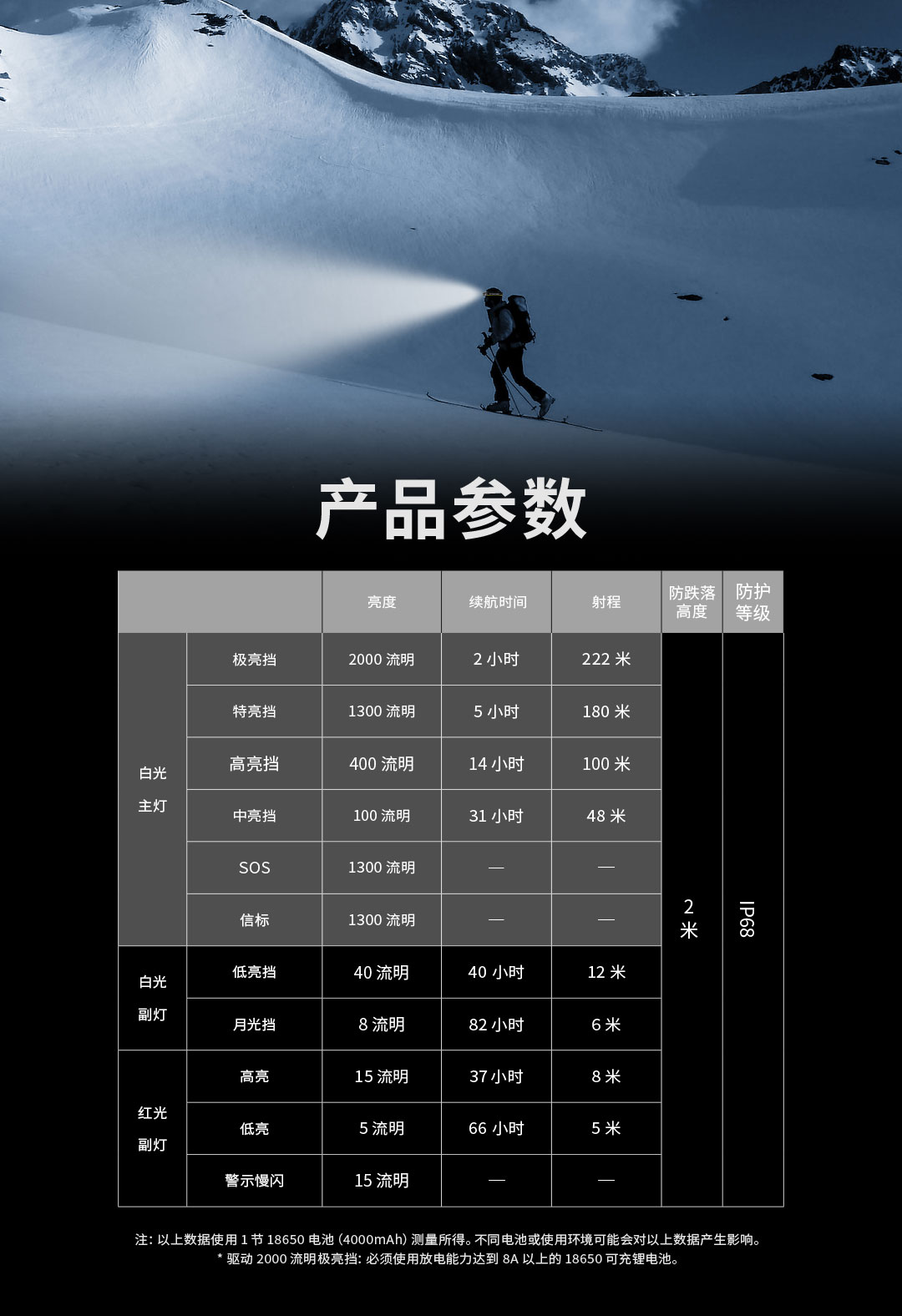 奈特科尔HC65 UHE三光源金属高亮头灯,首发超高光效UHE LED,8核架构最高2000流明输出,标配4000mAh 18650锂电池,拥有IP68级防尘防水与2米防跌落高度。