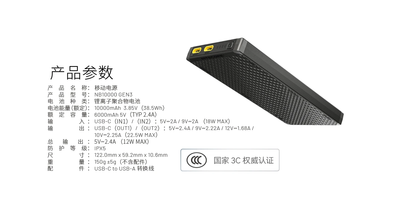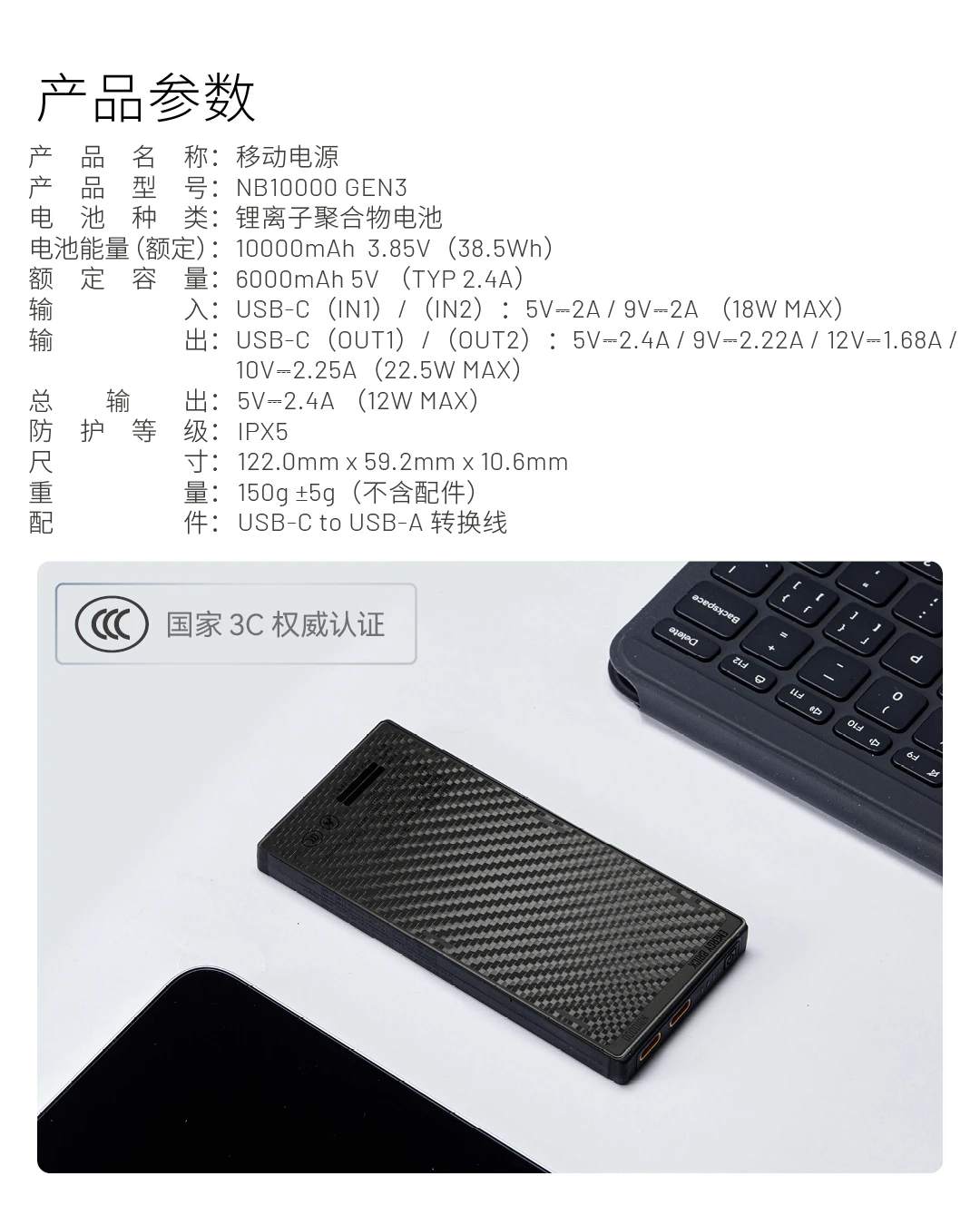 电池能量(额定):10000mAh 3.85V (38.5Wh)
