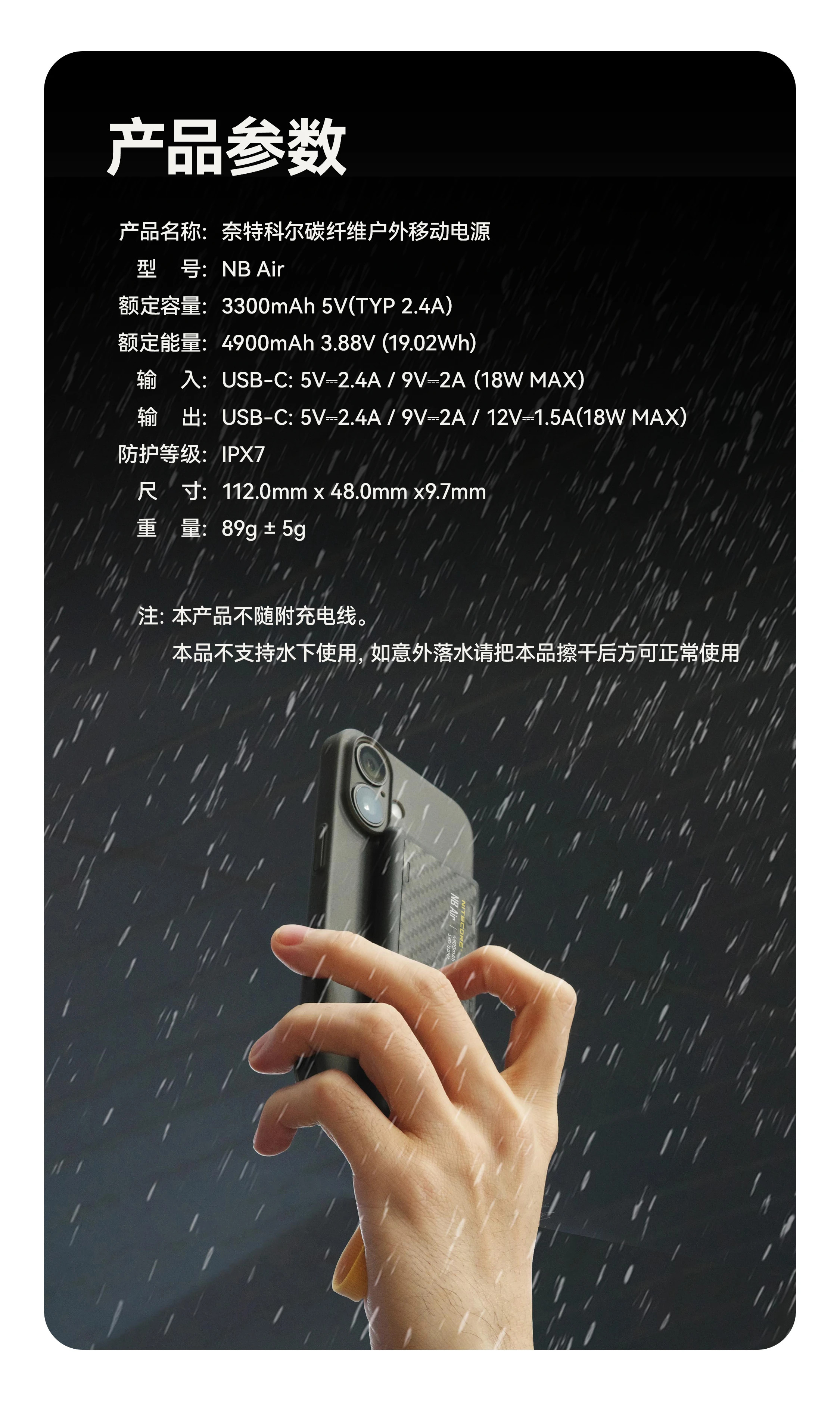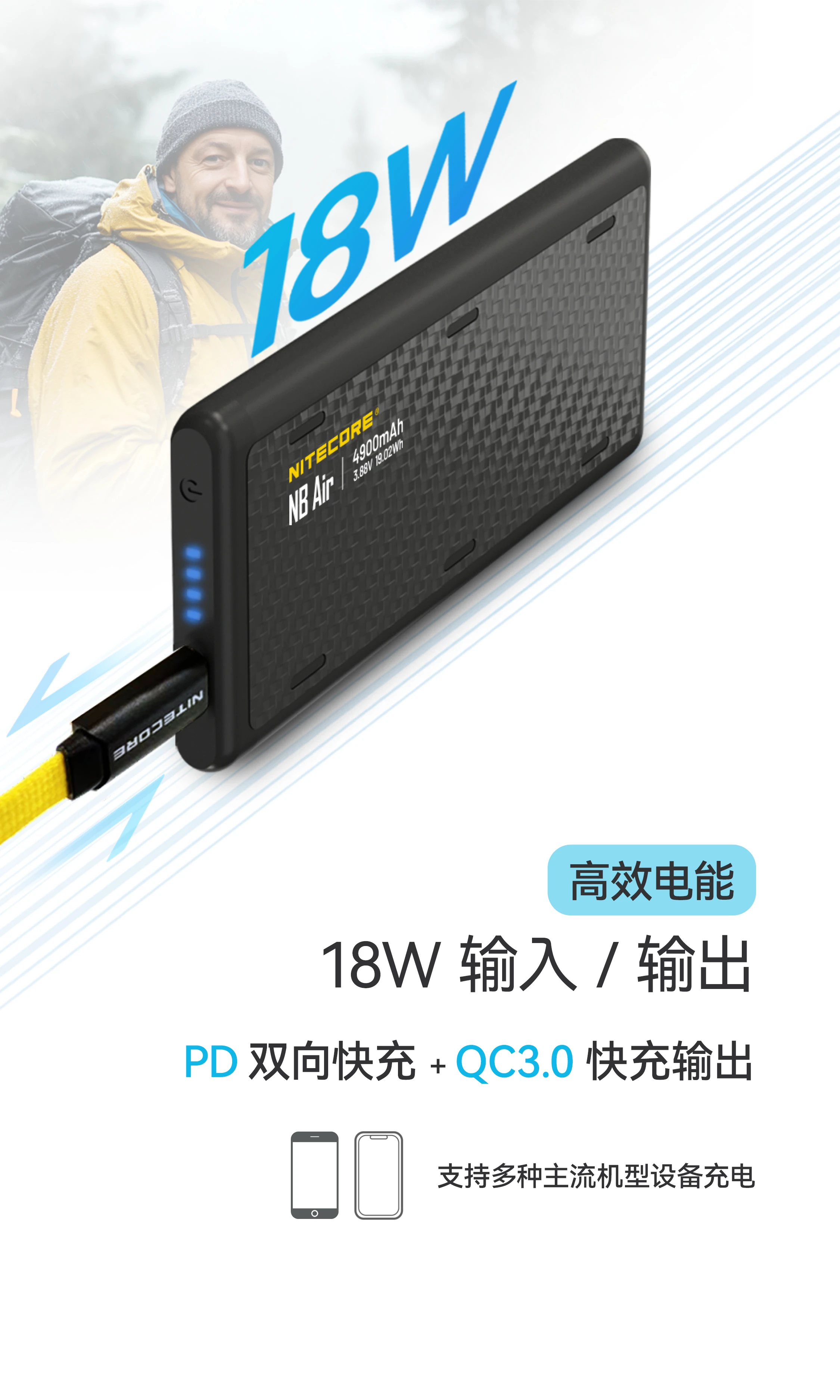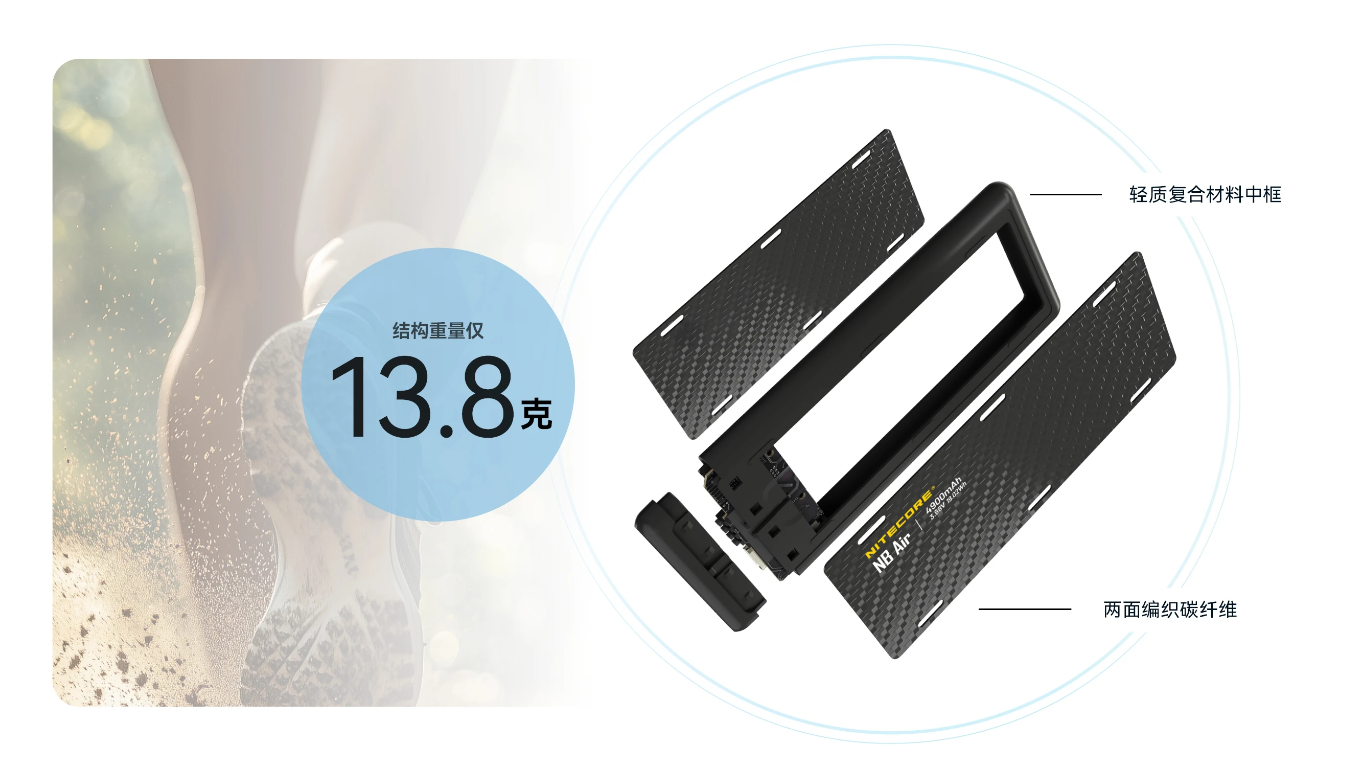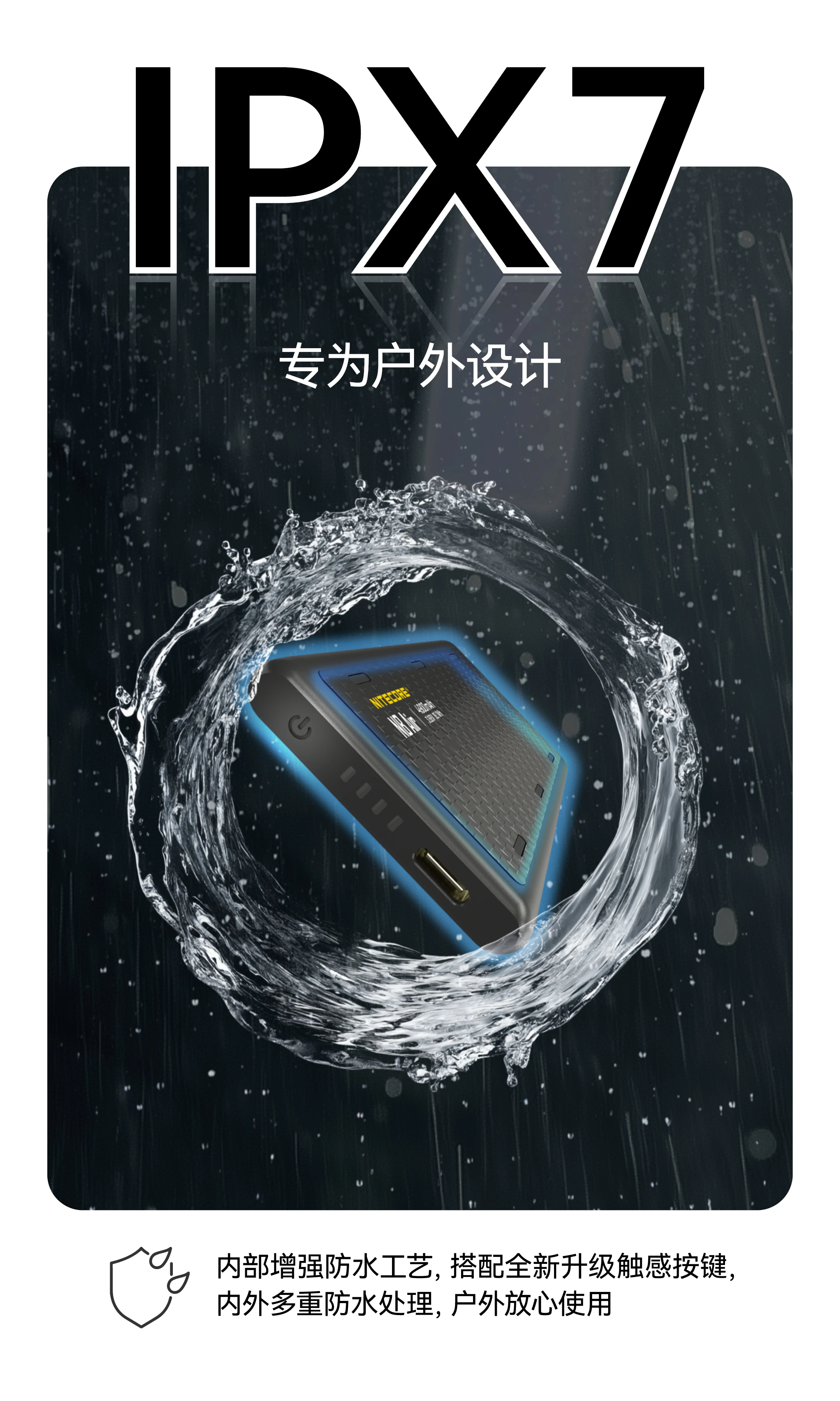 NITECORE奈特科尔NB Air 4900mAh赛用级防水充电宝,以仅89克与IPX7的超轻薄强防水组合设计,成为户外玩家的可靠补能搭子。