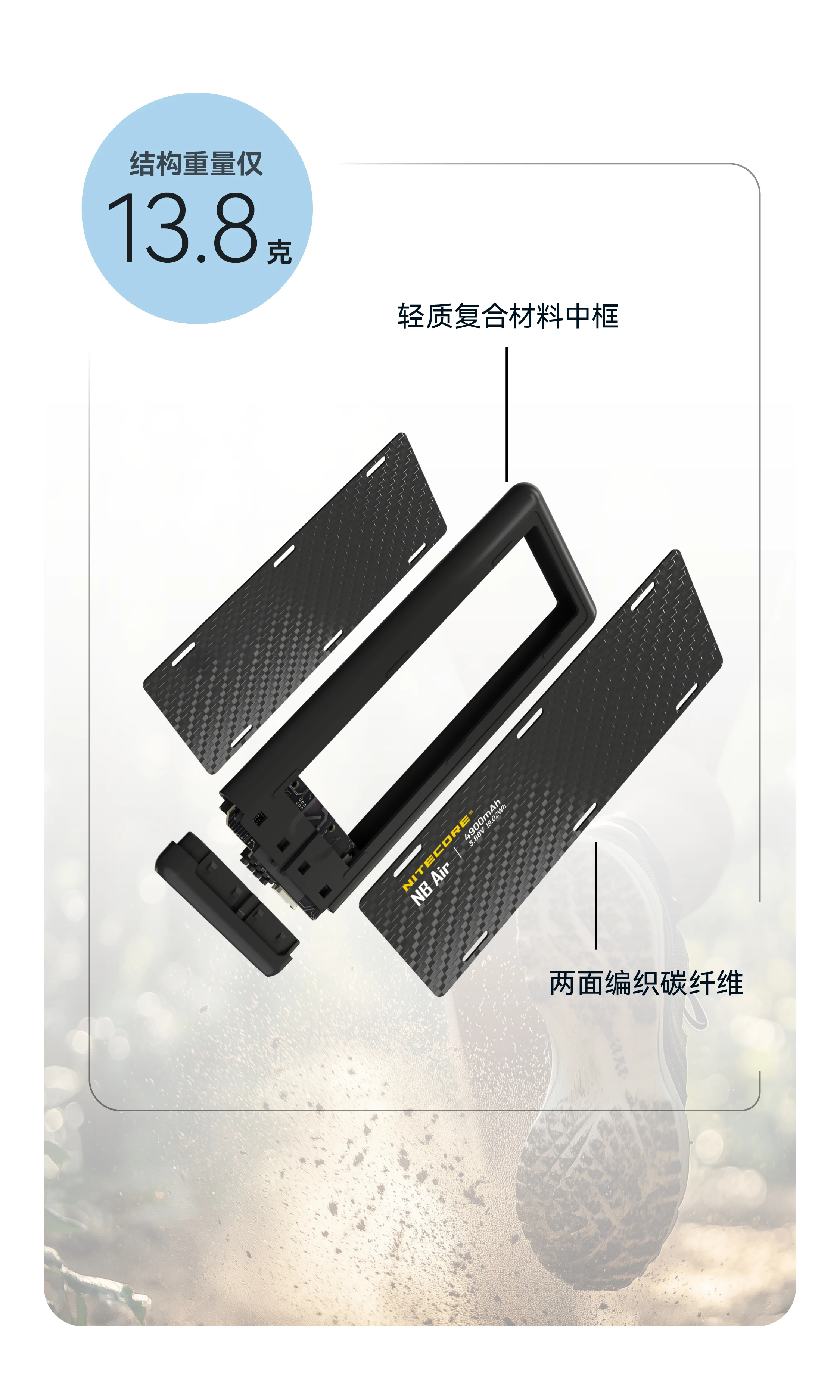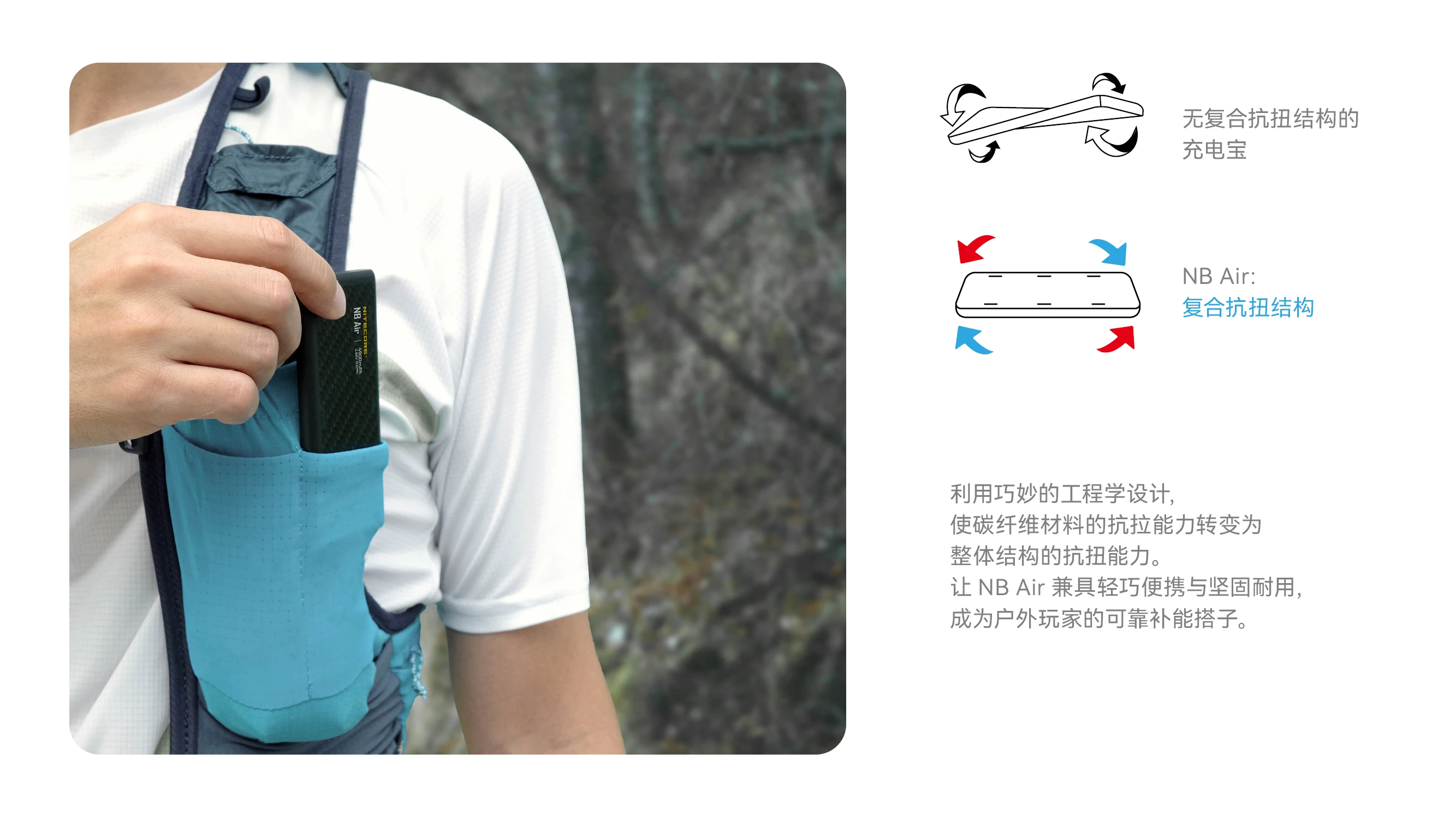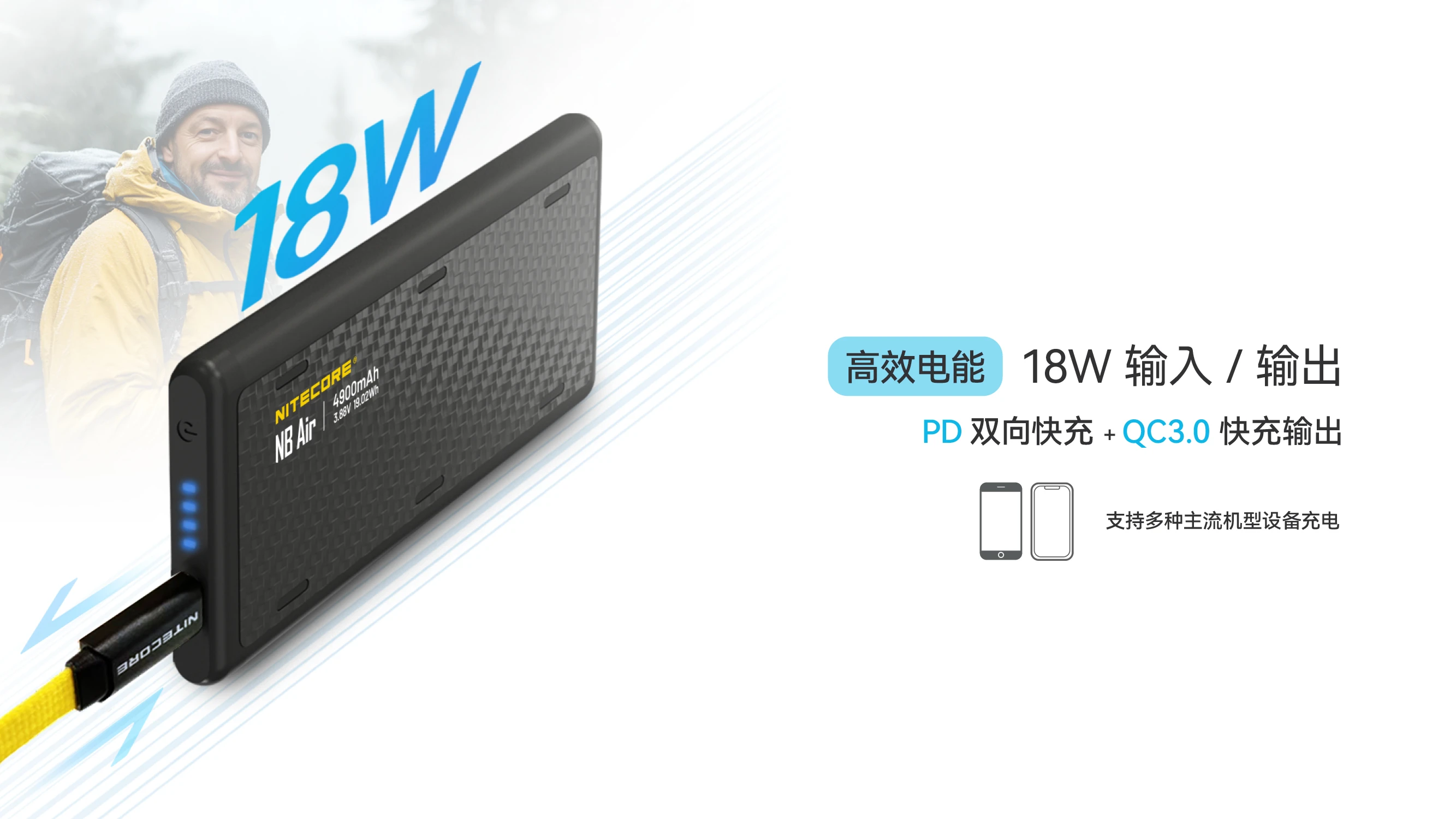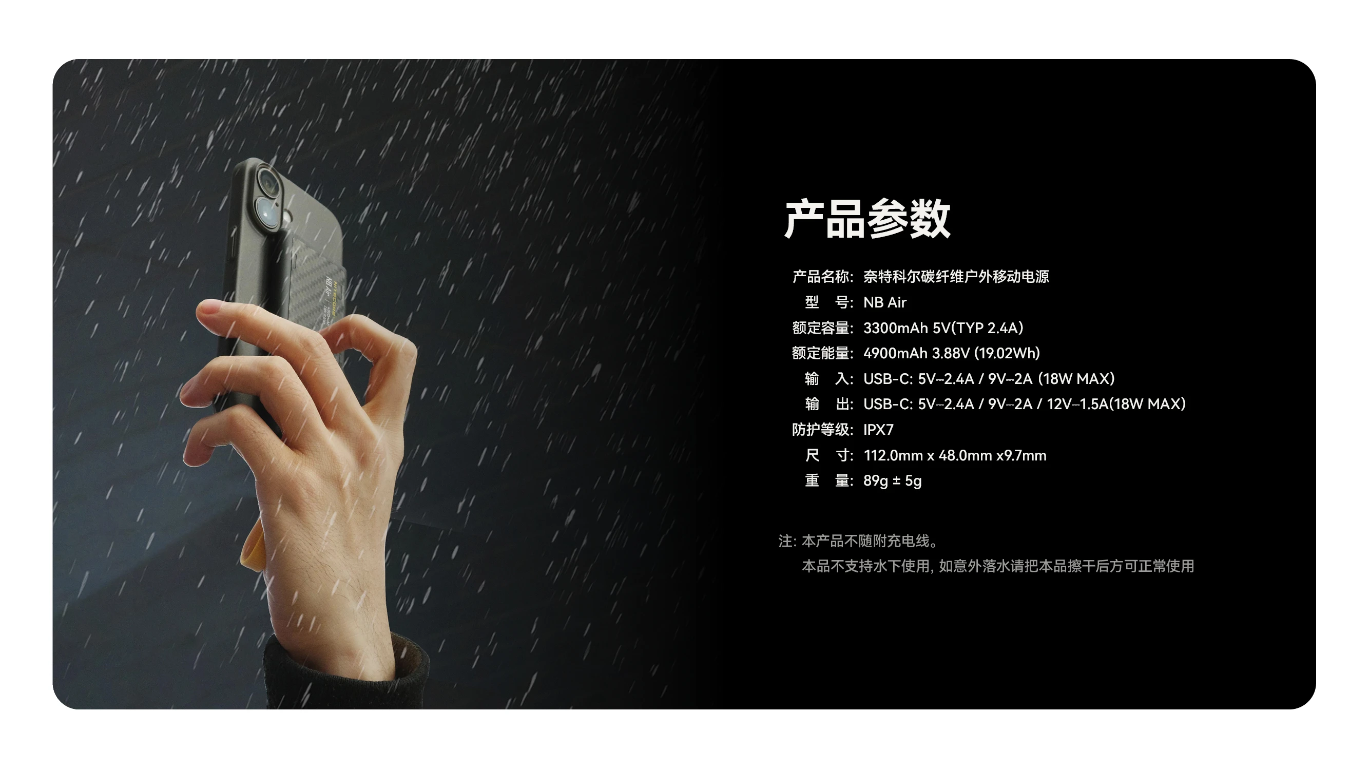NITECORE奈特科尔NB Air 4900mAh赛用级防水充电宝,以仅89克与IPX7的超轻薄强防水组合设计,成为户外玩家的可靠补能搭子。